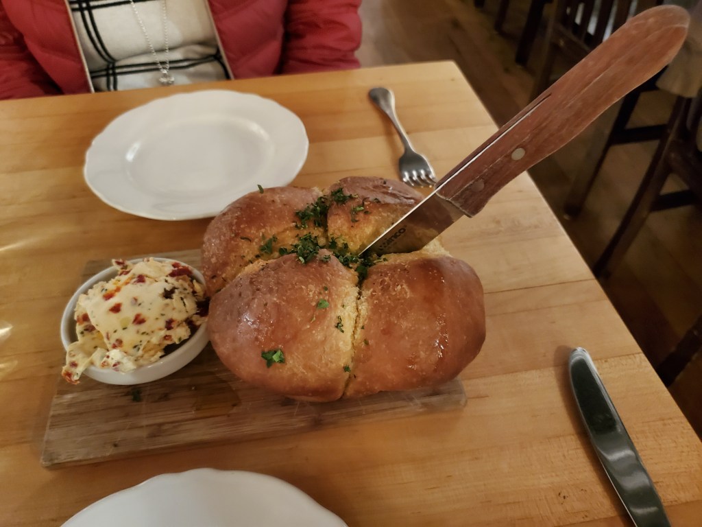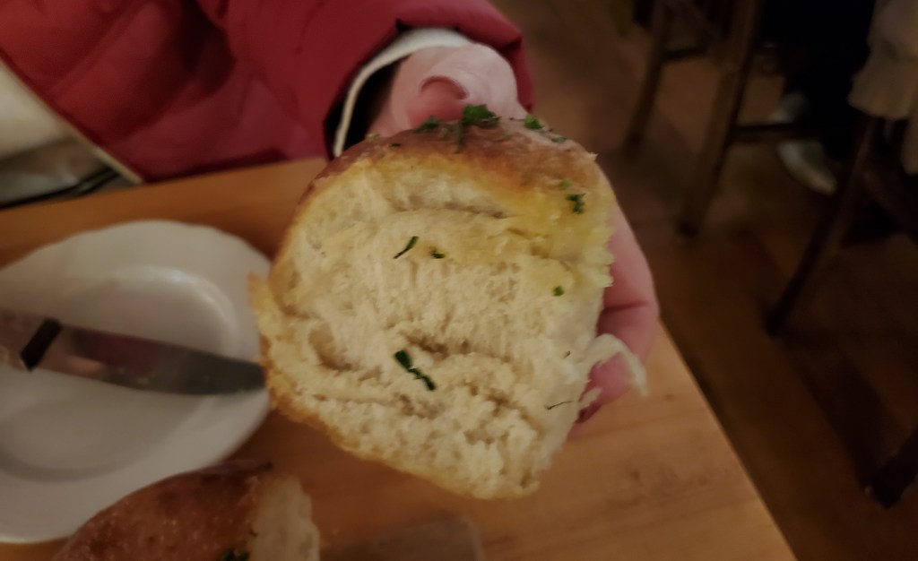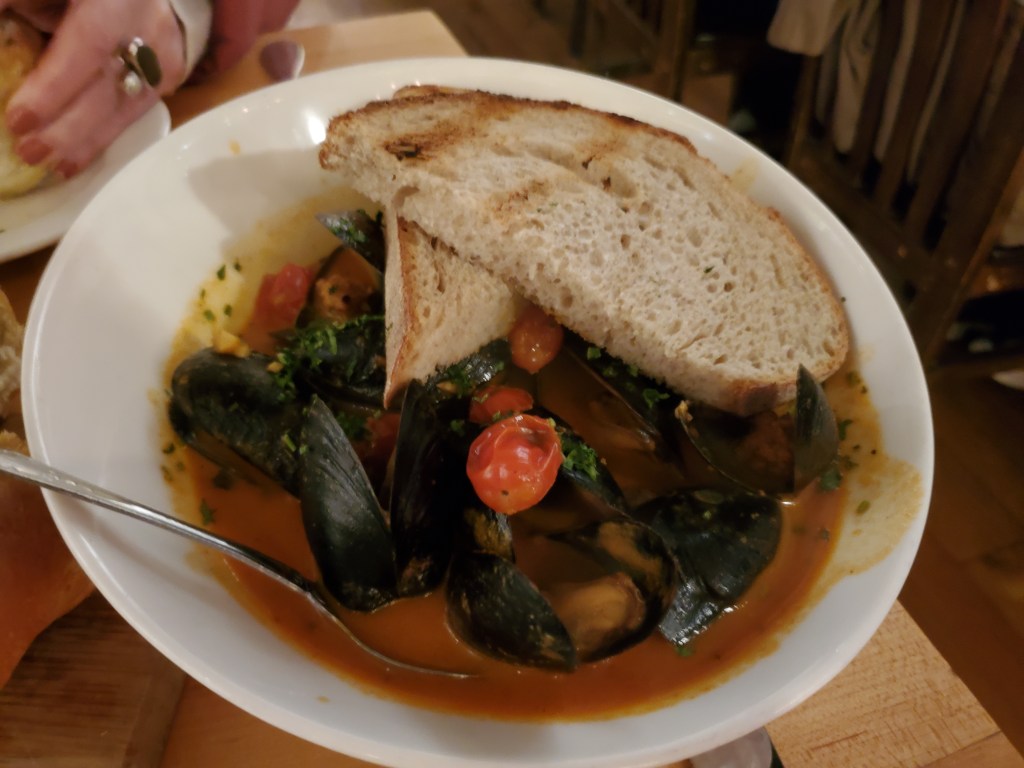When the first course arrived, we immediately questioned the wisdom of that decision. While the focaccia and butter were very good, each one of the four attached rolls were massive, and there was a little more bread than we expected with the mussels. It wasn’t a loss. My mother had a couple extra rolls to take home.