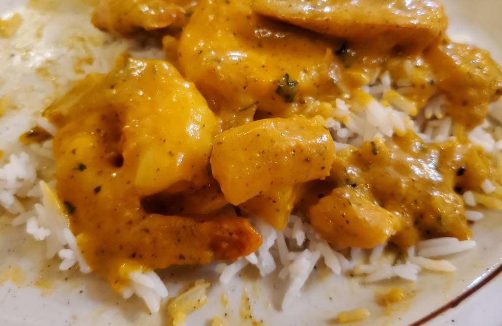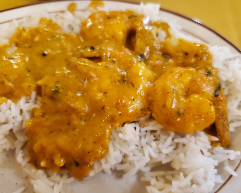 The mango shrimp that I ordered came in a heavily seasoned tomato-cream sauce and included small chunks of mango.