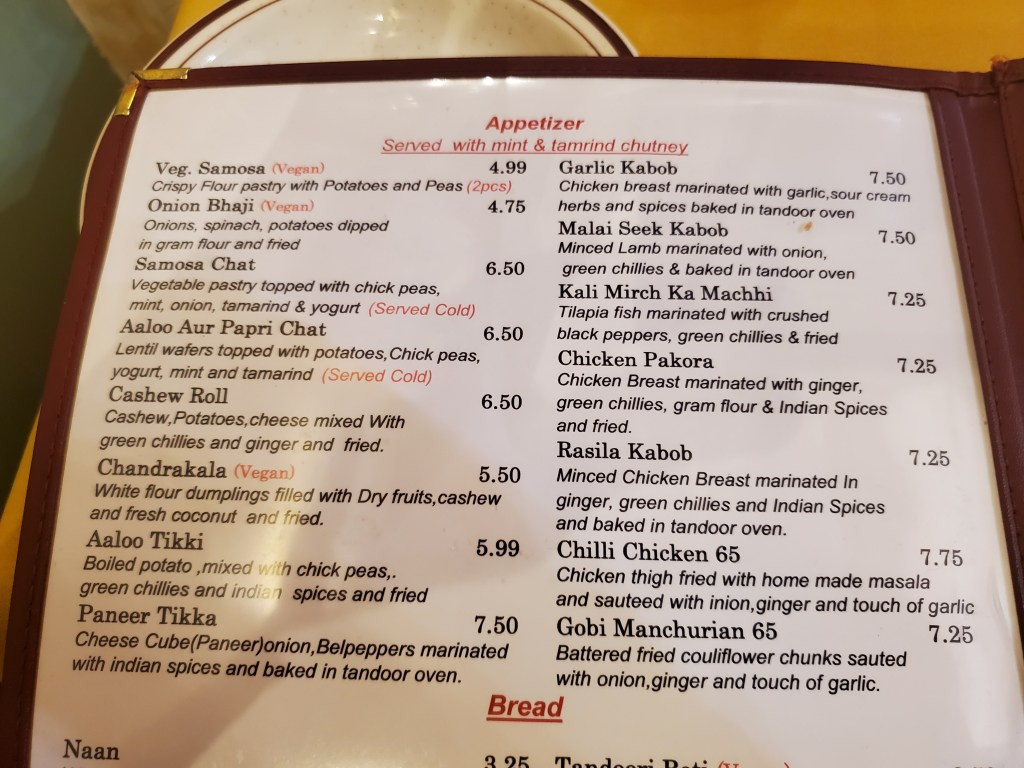 The menu had most of the standard fare that is commonly found at American-Indian restaurants with a few intriguing additions.