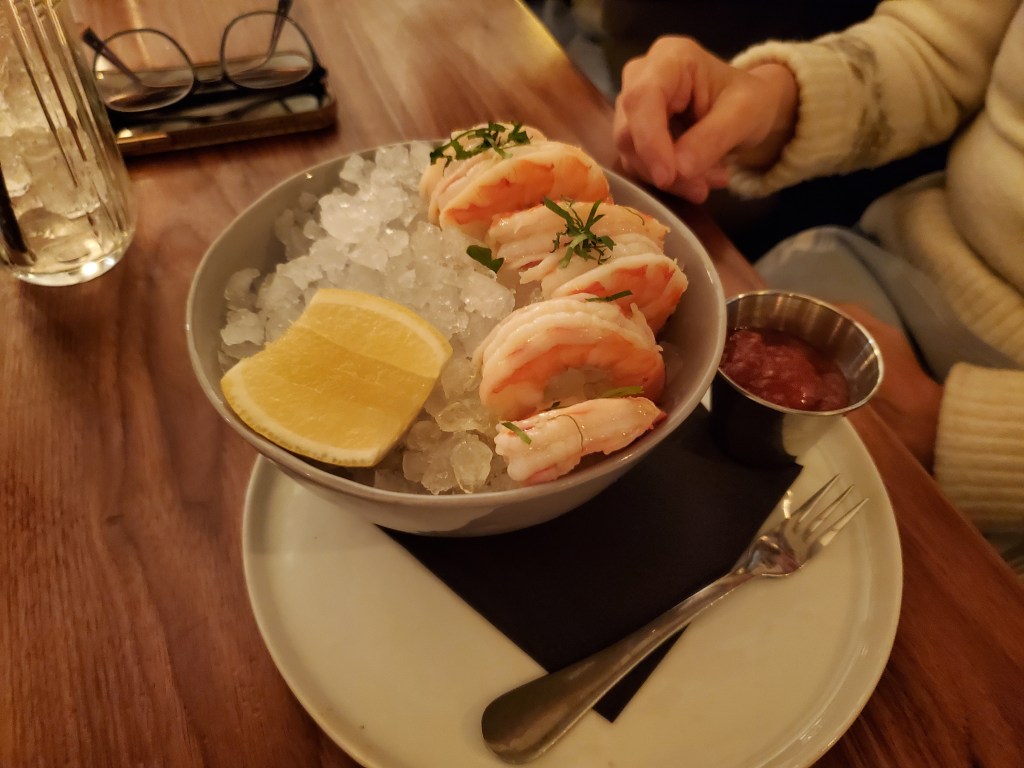 My sister went with 1950s America’s favorite appetizer, a shrimp cocktail, for her first course. She enjoyed it but felt that it came with an unnecessarily large amount of ice.