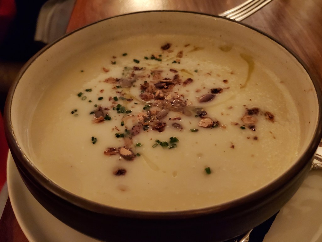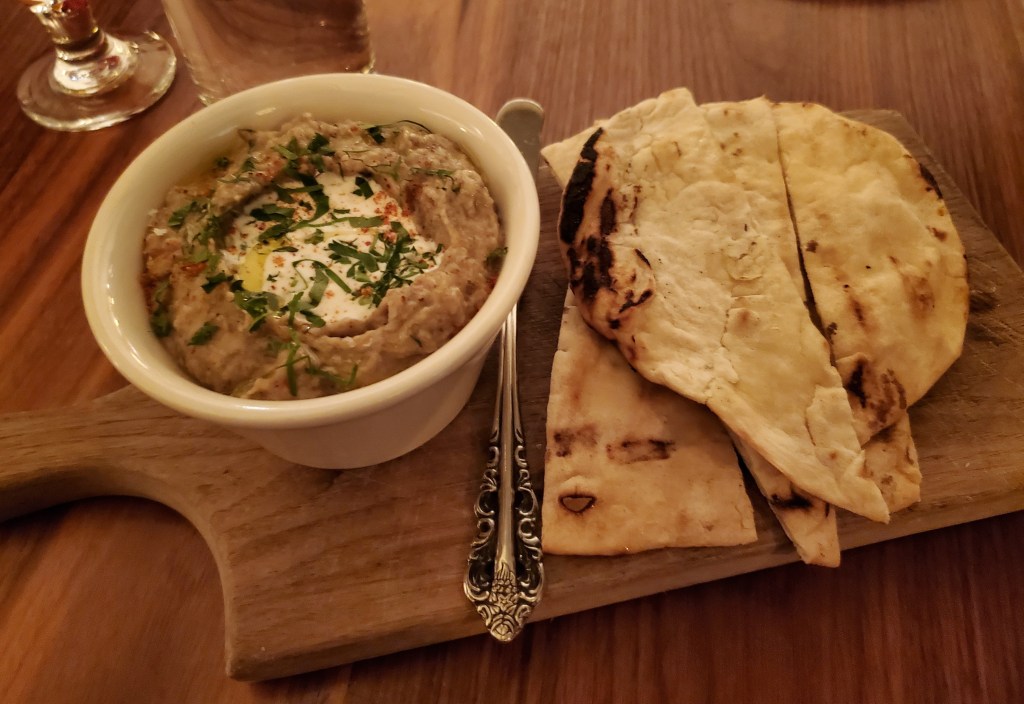 The charred eggplant dip with pita impressed my wife, although her bread-to-dip ratio was thrown off kilter after my stepfather took one of her pieces of pita. He may have needed it to go along with the potato leek soup that both he and my mother ordered.