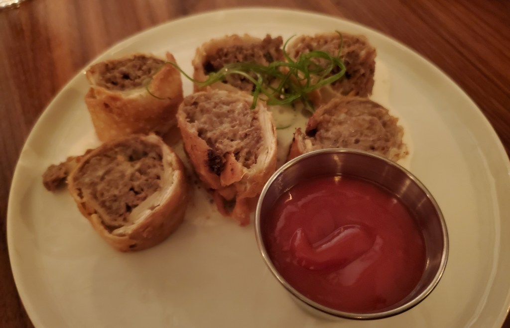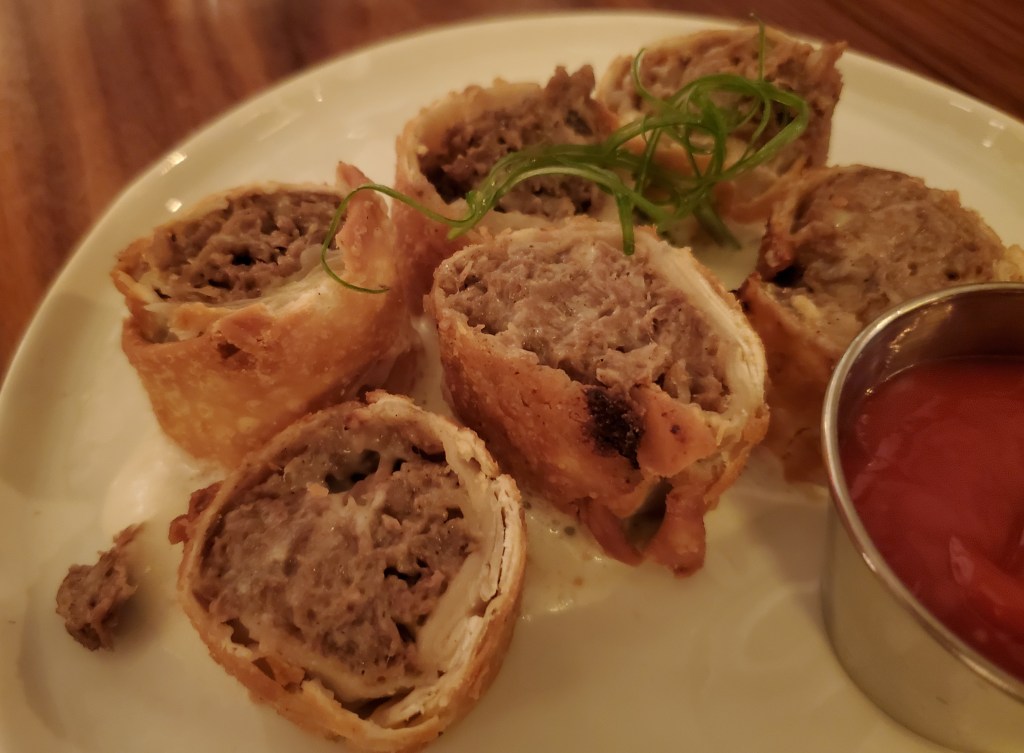 I started off with an order of cheesesteak egg rolls that included shaved ribeye, the ever-present Cooper Sharp cheese and spicy ketchup on the side for dipping. The three egg rolls arrived cut in half, and they hit the spot.