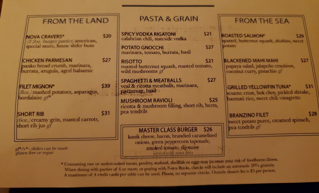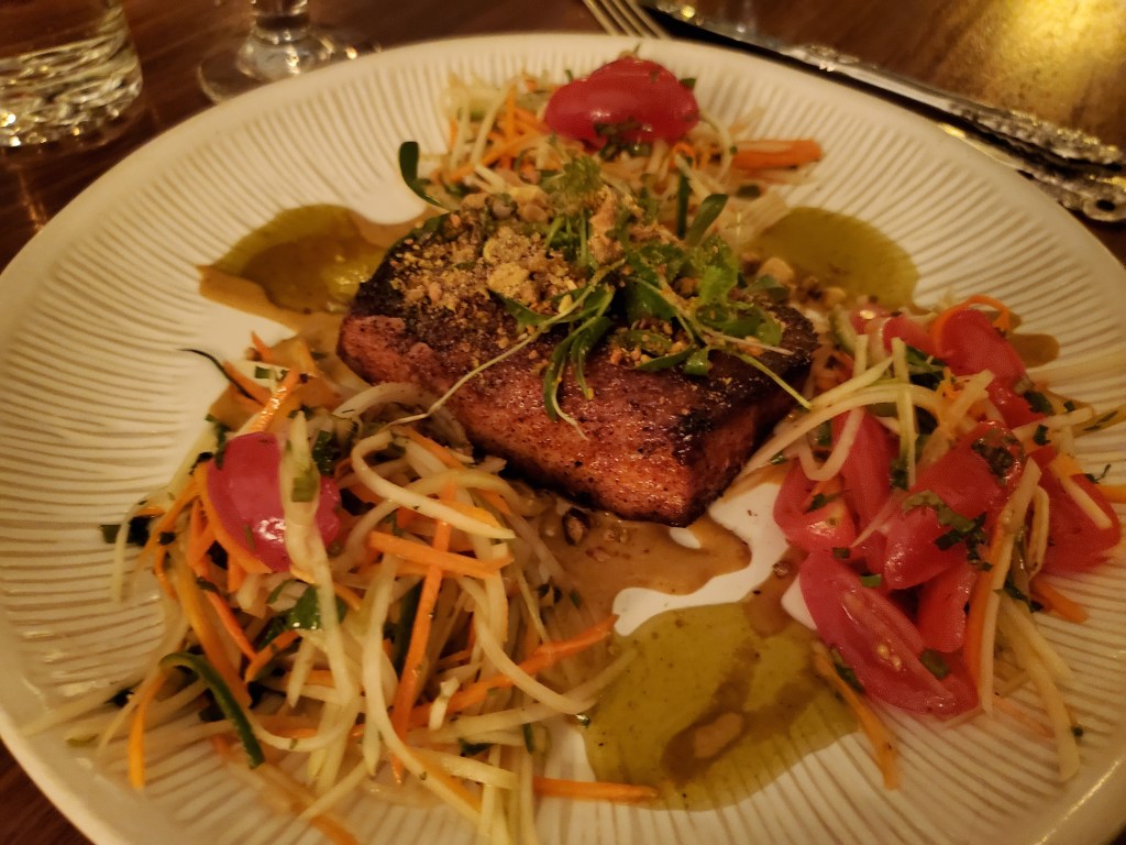For my mother, that meant blackened Mahi Mahi with papaya salad, jalapeño emulsion, coconut curry and pistachio.