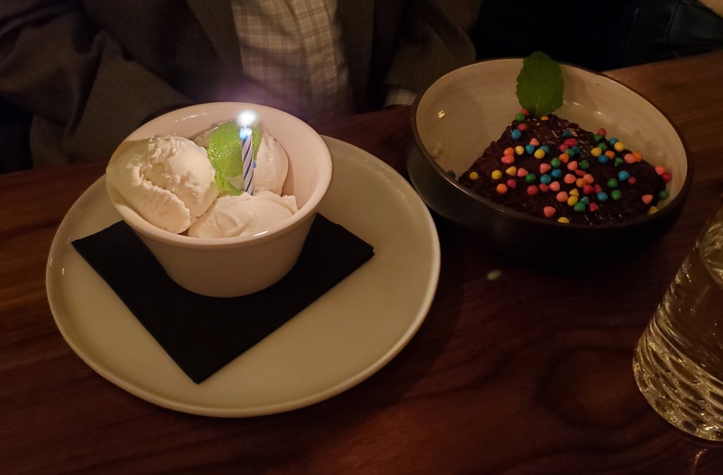 After our plates were cleared, we were presented with dessert menus. We had pre-arranged for something to be brought out to Abdel for his birthday, but he was unaware of that and ordered a brownie topped with candy pieces. The bowl of vanilla ice cream topped with a candle that came along side it was the perfect accompaniment for the brownie.