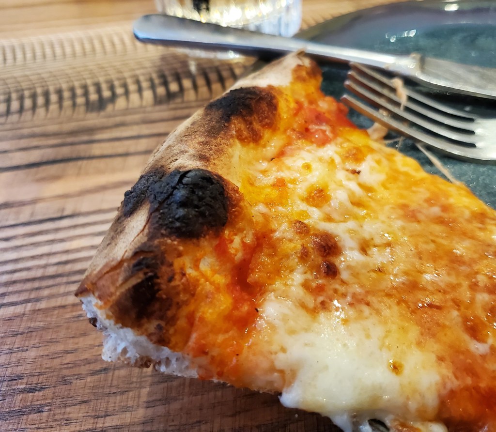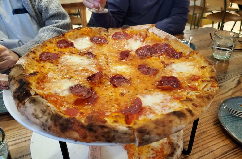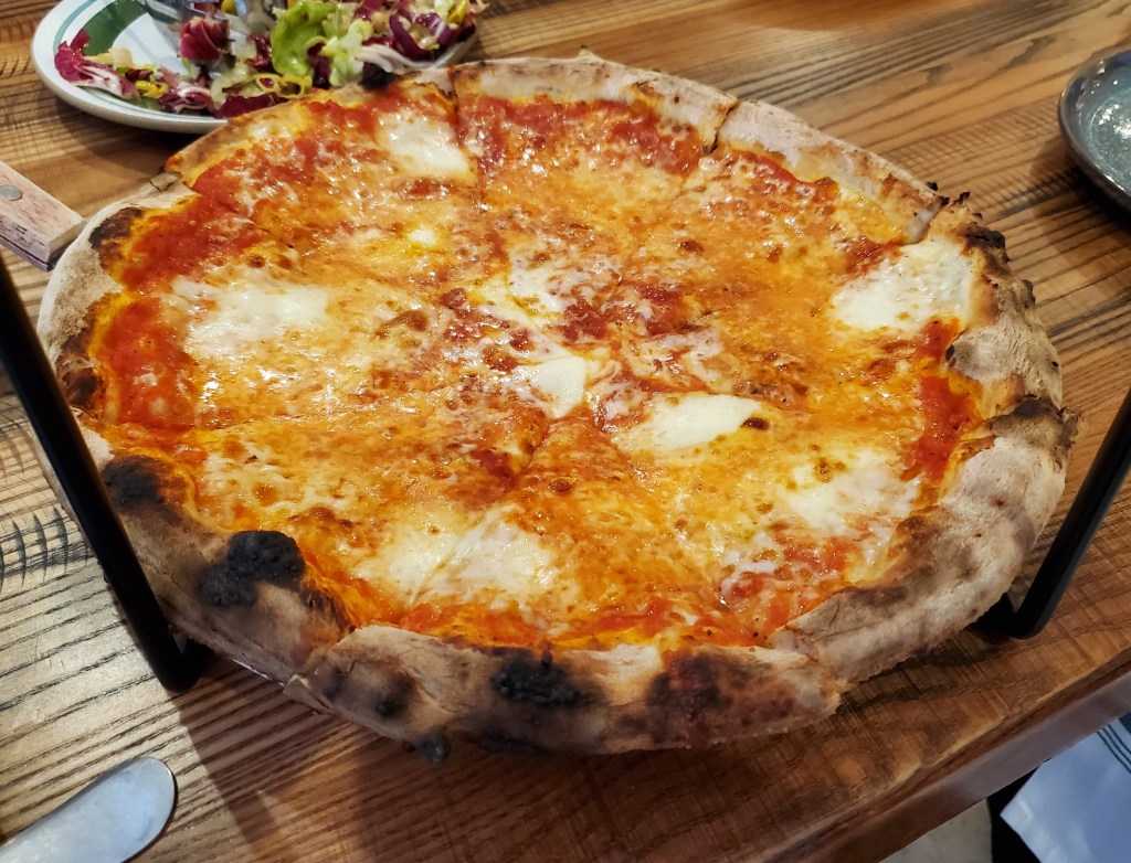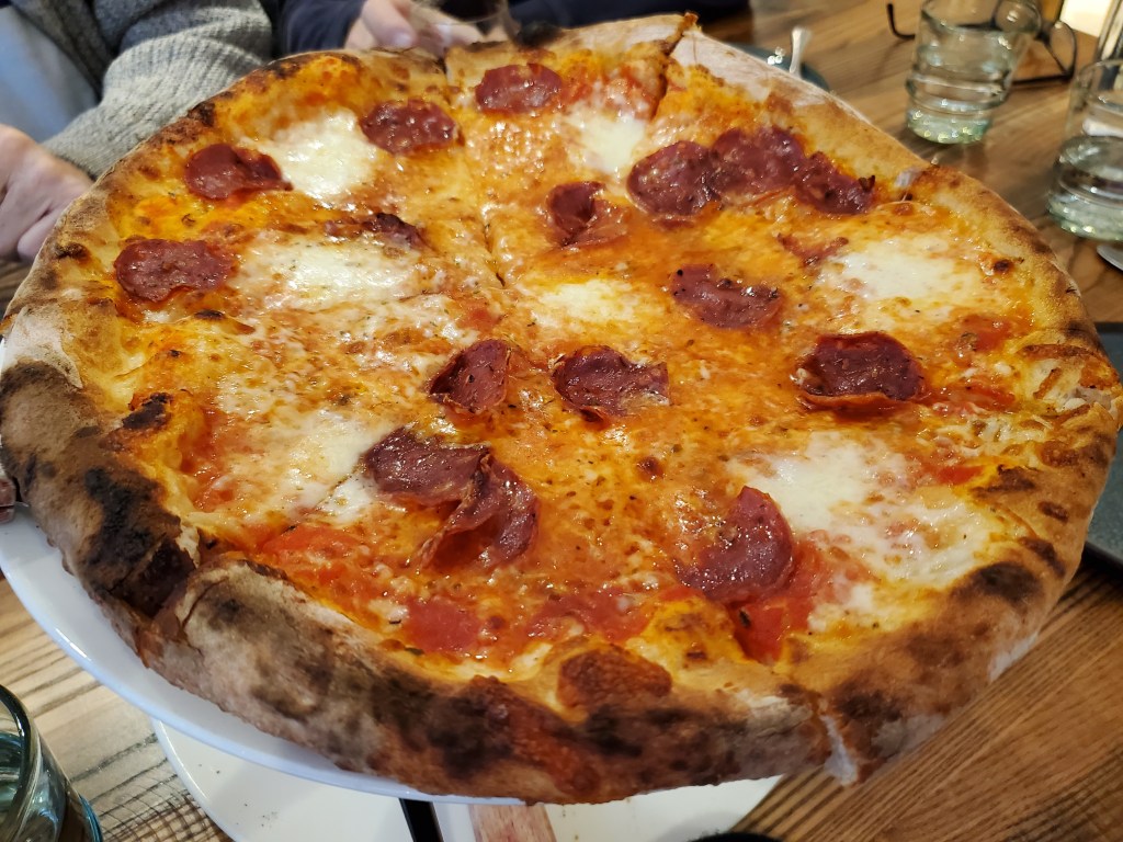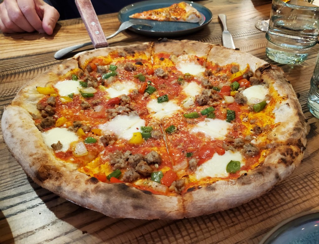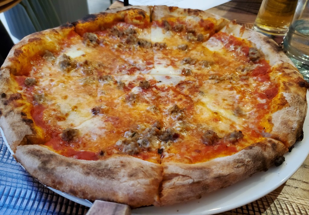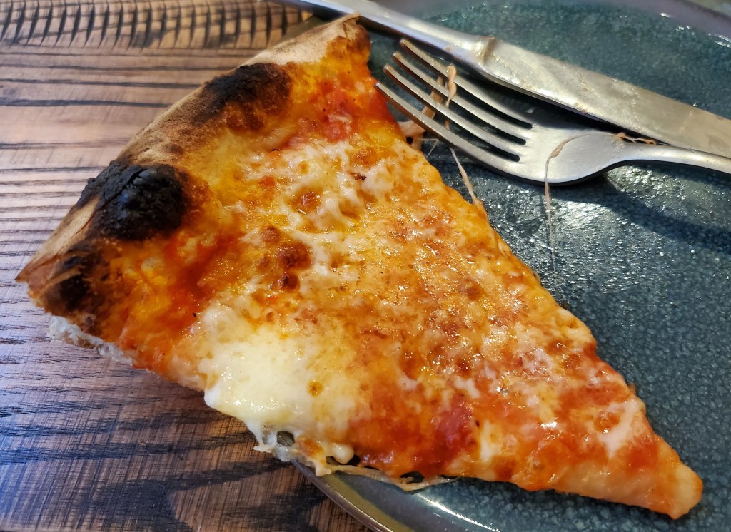 As you can see in the above photo, the New York Style cheese pie is one of the pizza options they offer. Most of their pies are a more traditional Neapolitan style. They’re very good, and we ordered one – the Fiorella sausage and peppers pie – to compare the two styles. The New York Style pizza is also available with toppings. We went for one plain and one each with sausage and pepperoni.