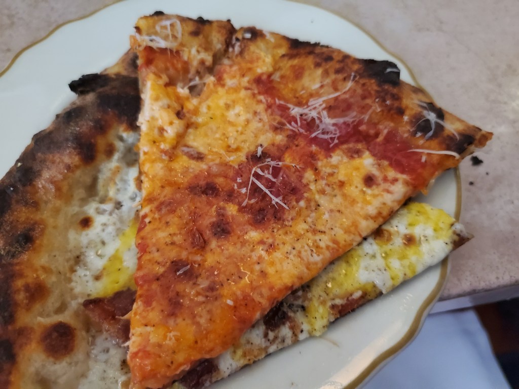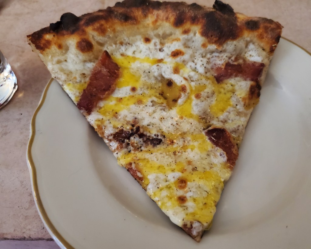 In addition to the pepperoni and a plain cheese pie, I was excited to see two different white pizza options that included egg, a topping I’ve grown to love as it’s become easier to find on menus at pizzerias with a gourmet bent. There being no objections, I ordered both the caramelized onion with egg and carbonara pies.