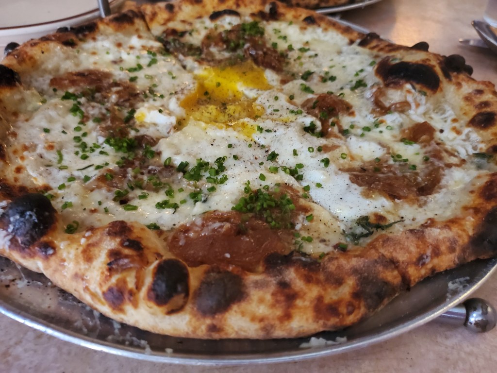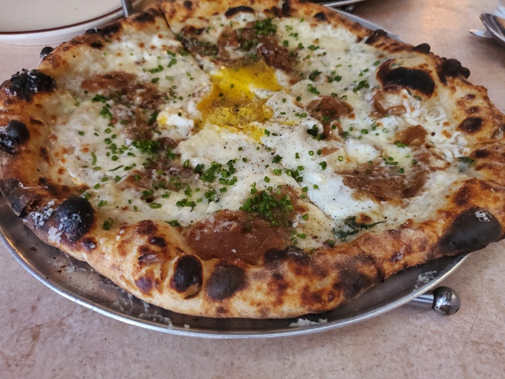 It’s much easier to find now, but I still was pleasantly surprised to see two different such pies on the menu, and each with additional toppings that I’m very fond of – bacon and caramelized onions.