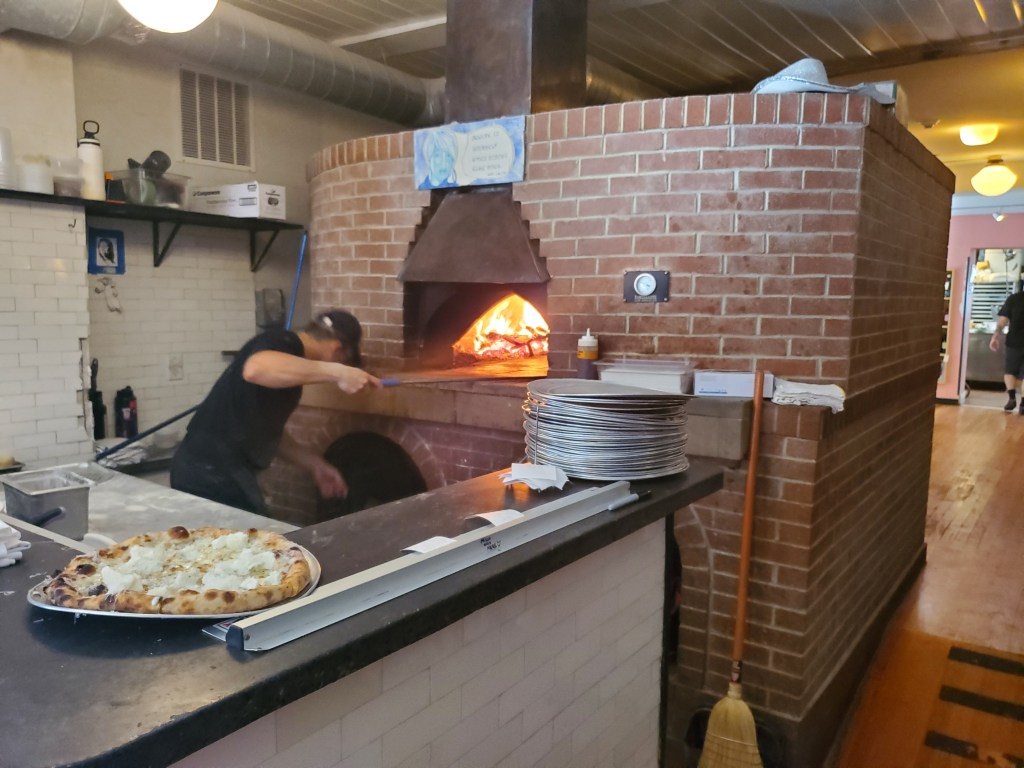 Although the bulk of Sally’s seating appeared to be outside, I had reserved an indoor table for us. It turned out to be the restaurant’s lone wrap-around booth, which is right next to the pizza prep area and oven, giving us an ideal vantage point along with comfortable seats.