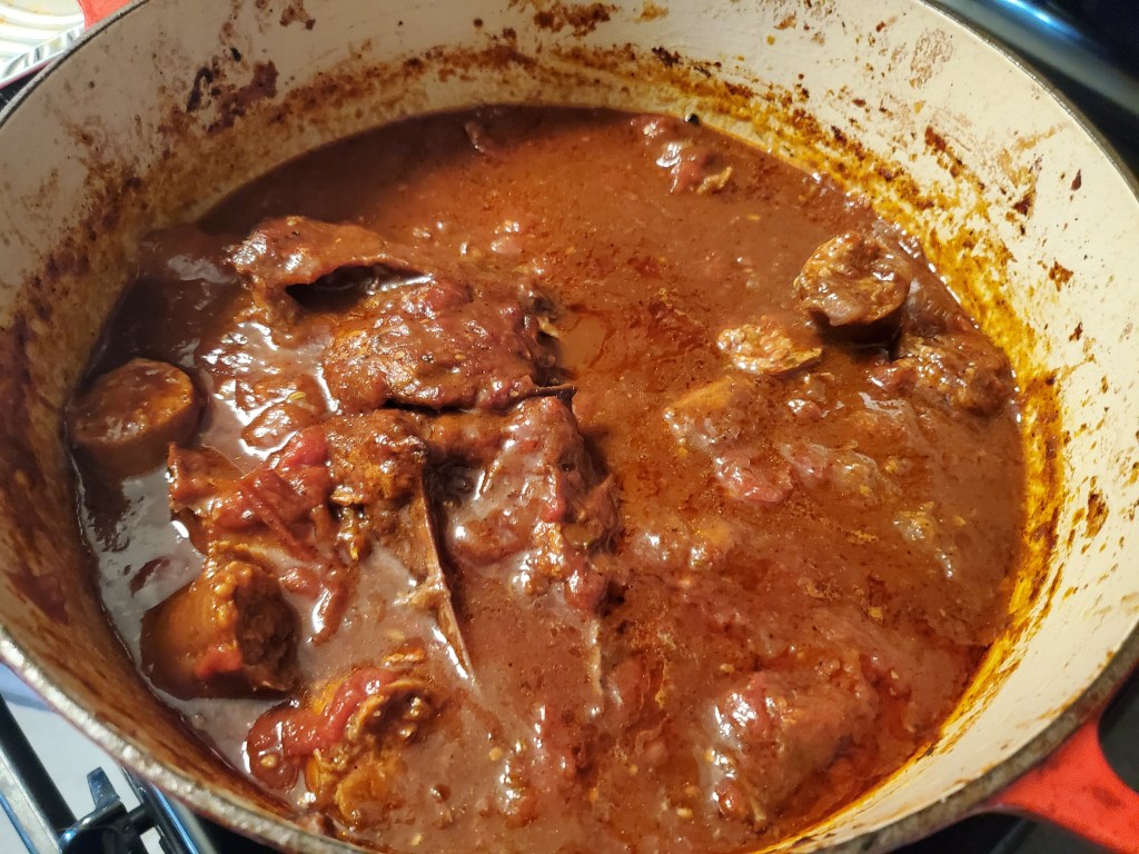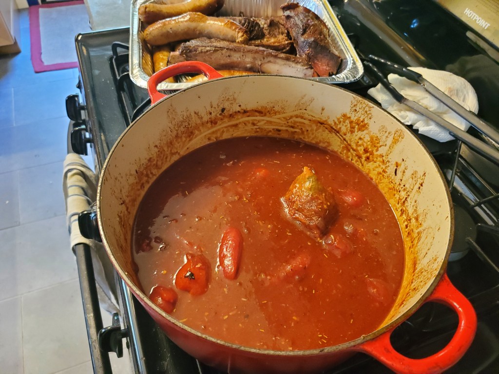 7. Allow the gravy to simmer 4-6 hours, stirring occasionally. About three hours in, start to break up the sausage links into smaller – 1”-2” – pieces with your wooden spatula. You can also remove any short rib bones that have detached from the meat at that point.