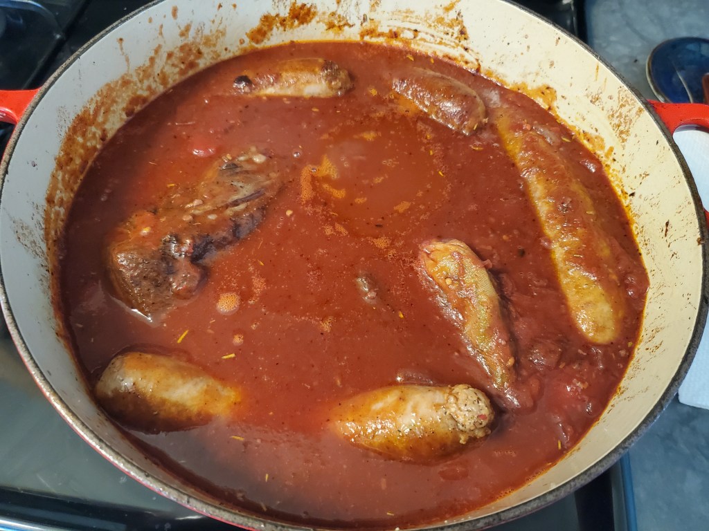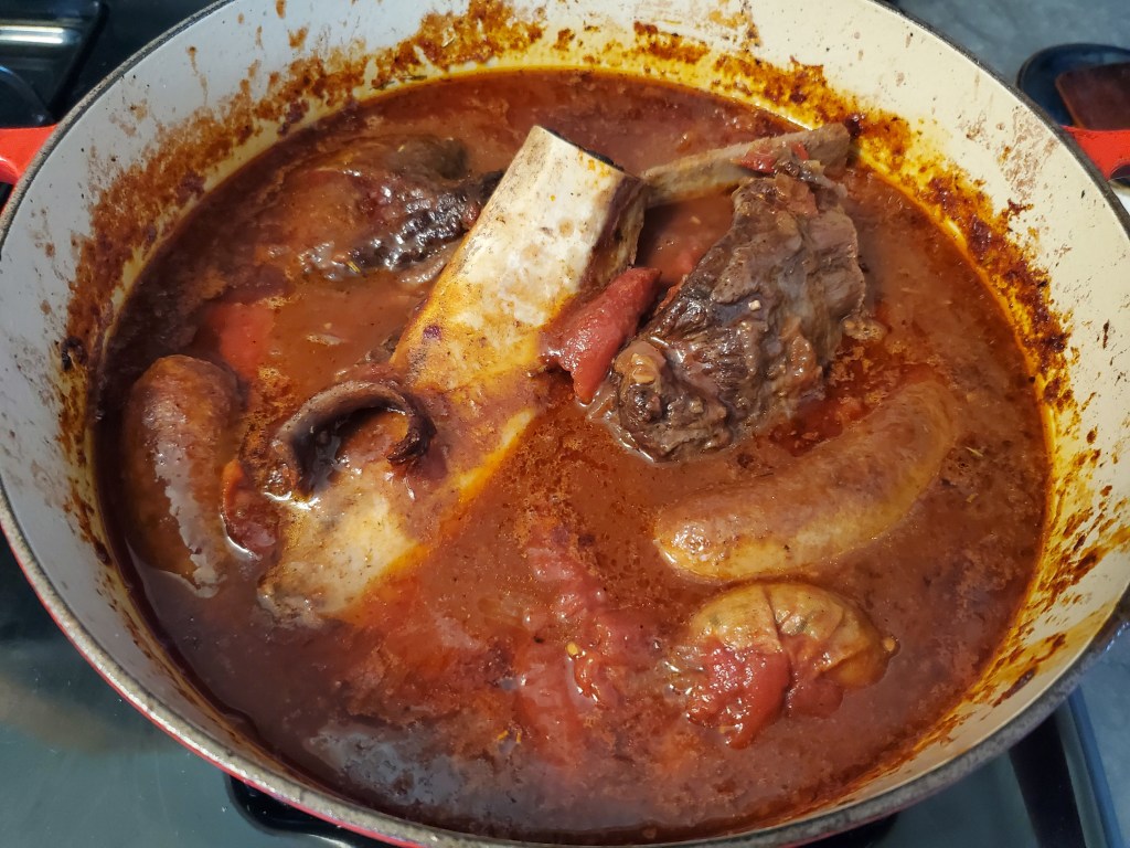 6. Bring the sauce to a boil over medium heat, then lower heat until achieving a low simmer. At that point, add the short ribs and sausage links to the pot and do your best to arrange them so that they are covered by the sauce.