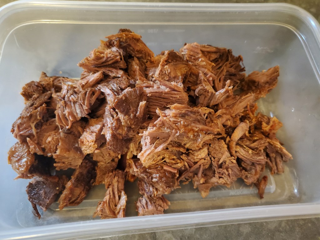 9. When the now boneless short ribs have cooled enough to handle them, cut off any large pieces of fat that didn’t fully render down in the pot and any portion of the membrane that remains attached to the meat and discard. Then cut the rib meat into small, bite size pieces or shred it. When you’ve finished doing that, place all of the cut or shredded pieces of short rib meat back into the gravy pot and give everything a good stir.