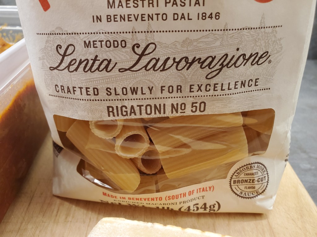 My preferred pasta for this recipe is rigatoni. But any pasta with ridges should work well. As with the canned tomatoes, I pay a little extra for imported pasta. De Cecco is an Italian brand found in most supermarkets that I generally prefer to the commonly seen domestic brands. Although as you can see in the photos below, I didn’t use it on this occasion.