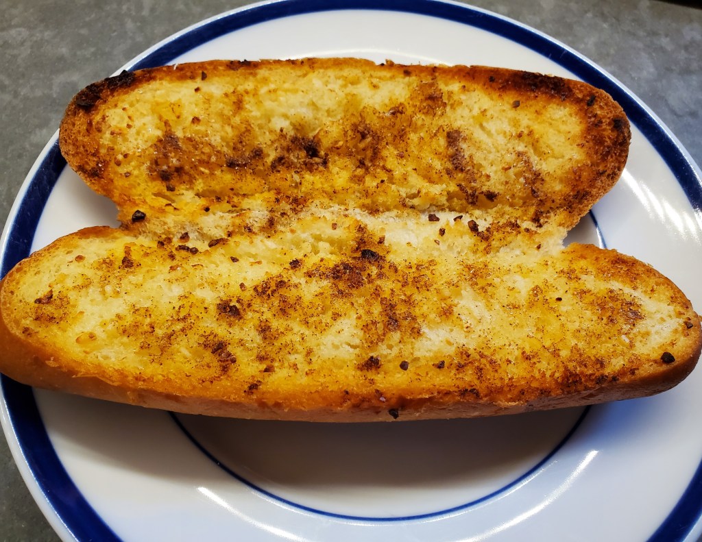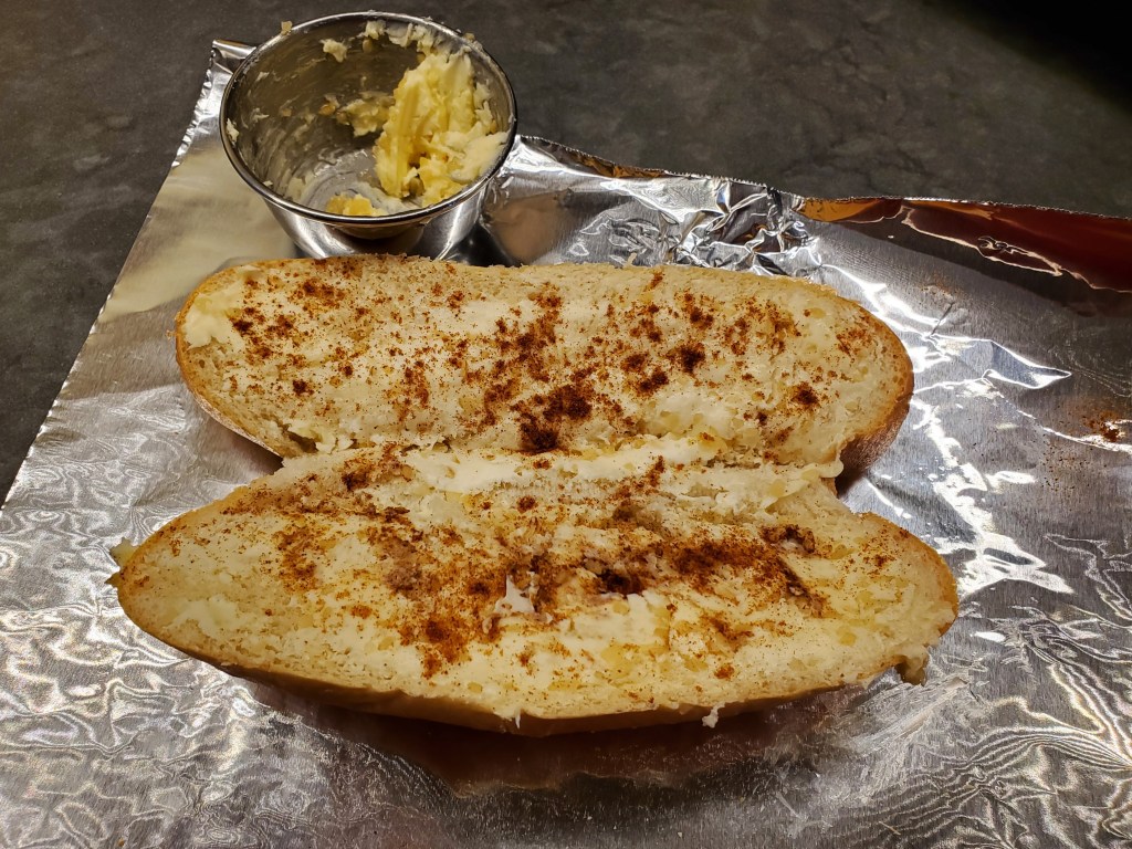 After slicing the roll length-wise, I softened about three tablespoons of butter in the microwave and combined it with some pre-minced jarred garlic along with a bit of liquid from the jar before spreading it all over the inside of the roll. I then topped it off with a bit of paprika for color. My mother always did that when she made garlic bread during my younger years.