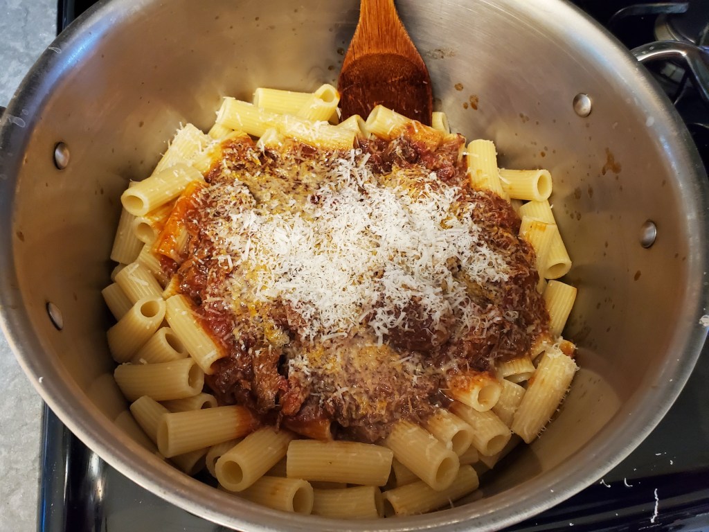 After draining the pasta, I put it back into the pot in which it was boiled and poured the simmering gravy over it before grating a healthy amount of freshly grated Parmigiano-Reggiano on top. The ingredients were then given a vigorous stir to get everything combined and gravy into as many pasta grooves as possible.