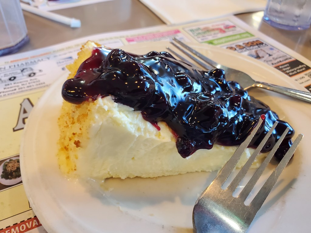 From the site of my great disappointment, we moved on to a classic-looking diner down the street that has a sign proclaiming their cheesecake to be world famous. The ribeye that came as part of my steak and eggs made me think of what condemned prisoners must be served for a final meal. The cheesecake was fine, but I doubt anyone is discussing it beyond the diner’s immediate environment.