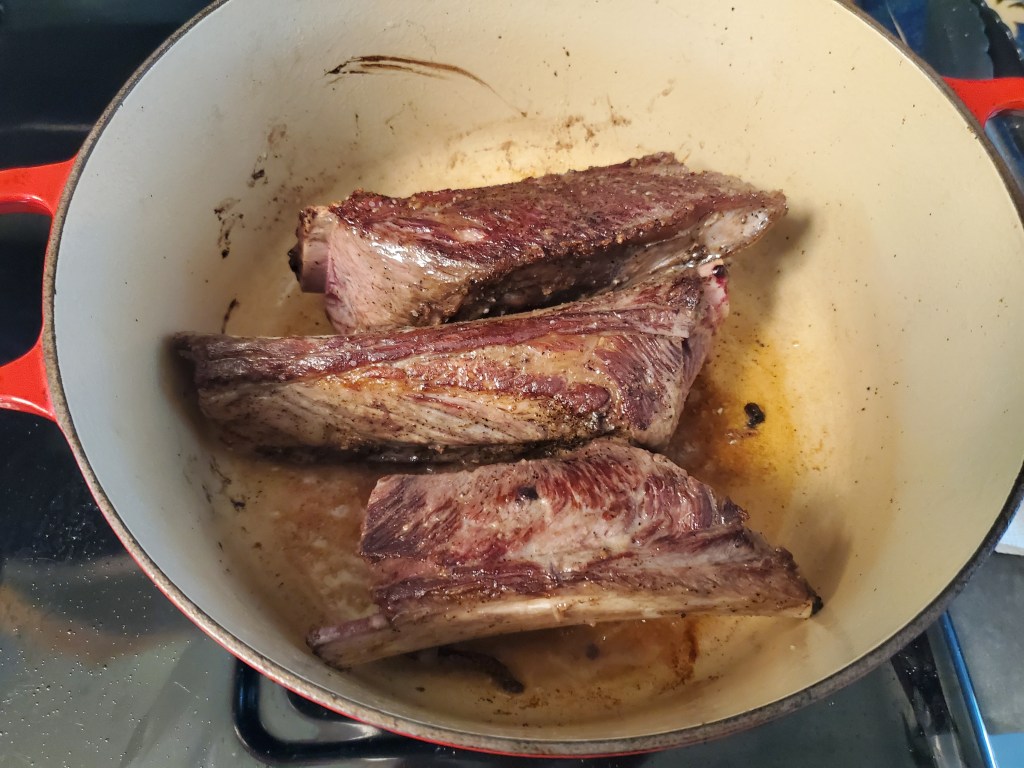 1. Pour the olive oil into a well heated pot that is big enough to hold all of the ingredients. After giving the oil a moment to heat, place the short ribs into the bottom of the pot and sear them on all sides. This should take several minutes per side. When finished, remove the ribs from the pot and set them aside, but leave the rendered fat and grease from the searing process in the pot and don’t turn the heat off. If fitting all three ribs onto the bottom surface of the pot is difficult, do this step in two batches.