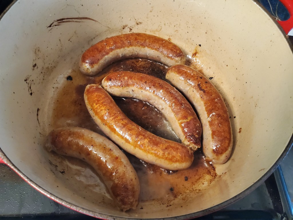 Place the sausage links into the bottom of the pot and brown them, making sure to spin them periodically so that all sides are browned.