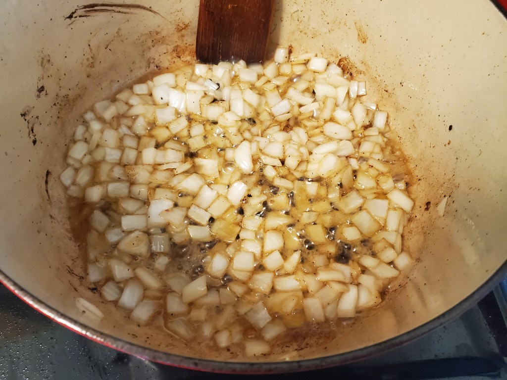 At this point, place the chopped onion into the pot over a medium flame and stir occasionally until they are soft. Add the garlic, stir, and allow to sit for just another half minute so that the garlic won’t burn.
