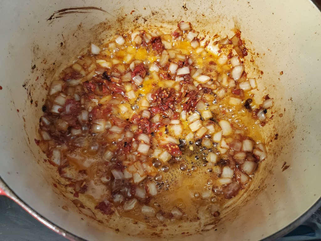 When you’re finished browning the sausage links, remove them from the pot and set aside, again leaving the flame on and accumulated oil and rendered fat in the pot.