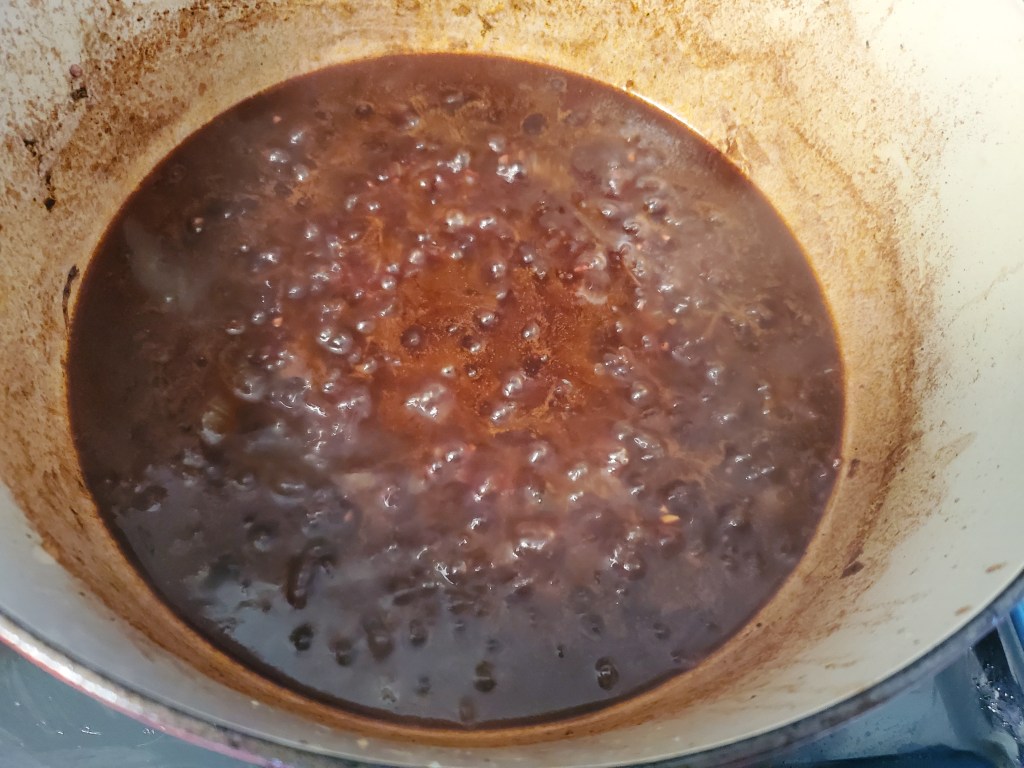 While the wine is boiling, you should be scraping off whatever has stuck to the bottom and sides of the pot during the process of searing the meat with a wooden spatula. Keep doing that until you’ve gotten as much off the pot as possible. This is important for flavor.