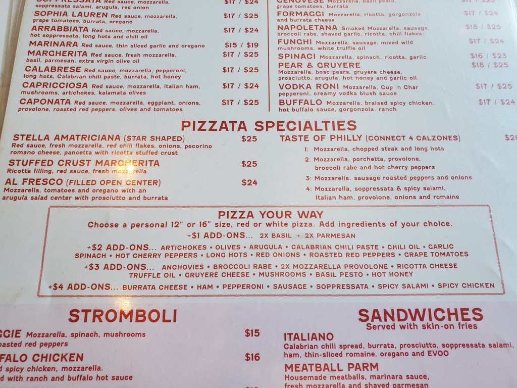 Pizzata offers a nice array of appetizers, salads and pasta in addition to several interesting pizza variations. But I kept it pretty basic with a pair of large pizzas – one with pepperoni and sausage – and a cheesesteak stromboli.
