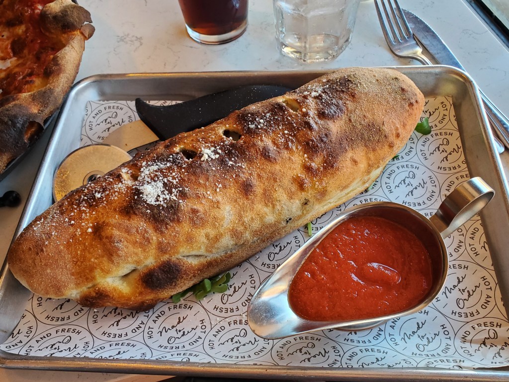 Strombolis often come with the sauce mixed with the meat and cheese inside the crust. But I prefer it on the side and was pleased to see a generous portion of it for pouring on the serving plate.