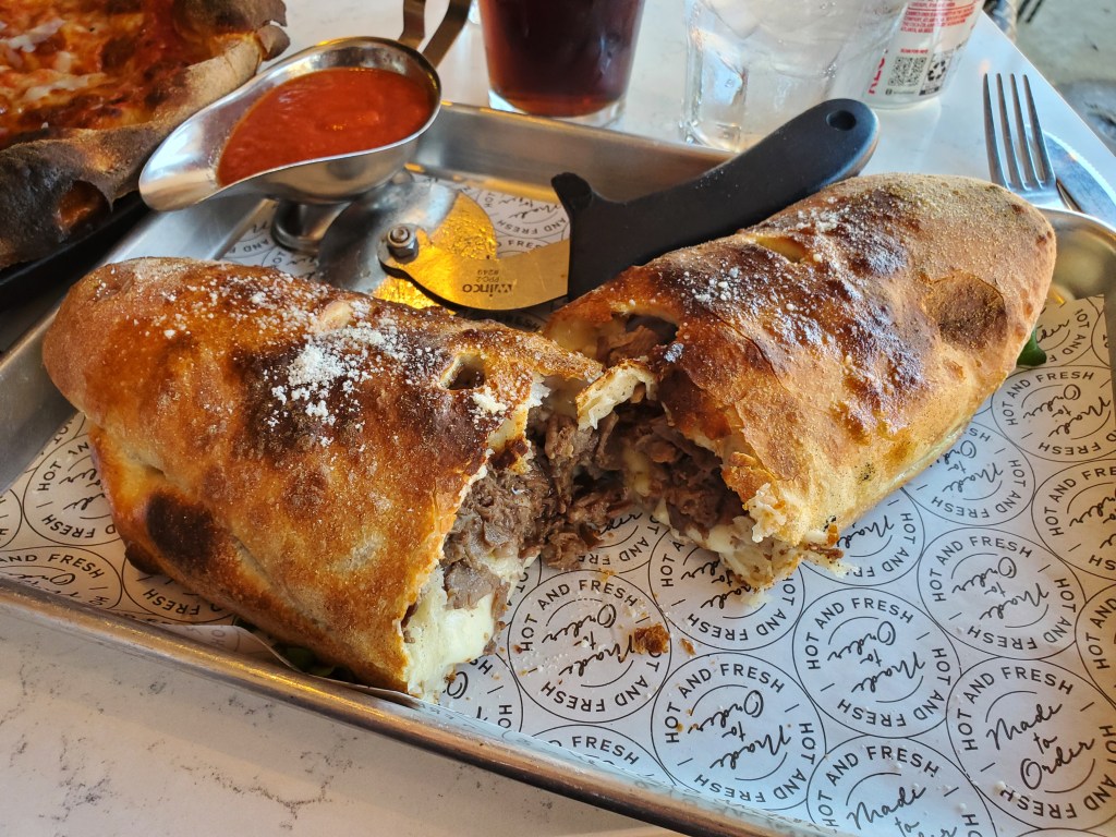 The stromboli arrived first and my initial visual impression was very positive. The most common problem with cheesesteak strombolis is that the moisture from the steak and cheese often leaves at least the center portion of the crust looking and feeling like a gooey mess. That wasn’t the case at Pizzata.