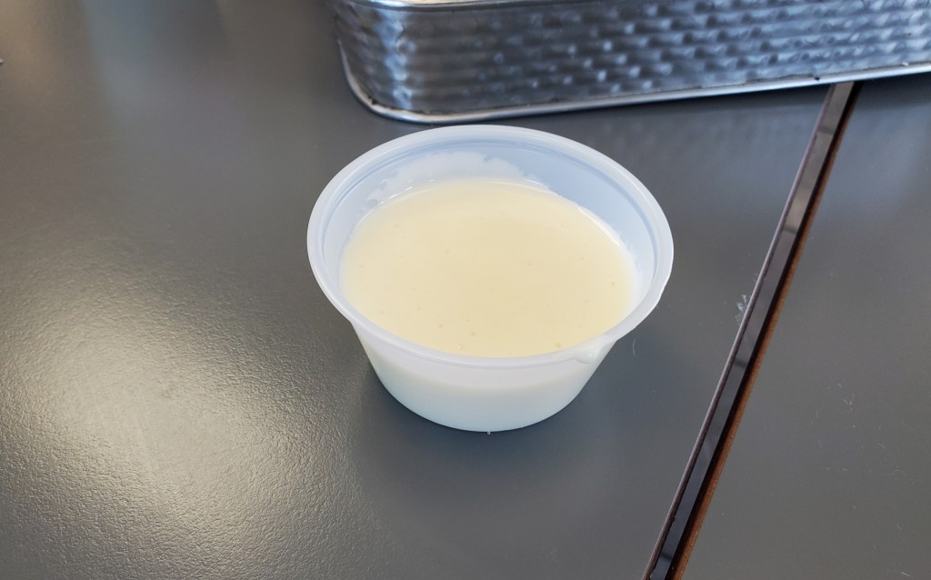 We were given this small cup of extra Cooper Sharp sauce but didn’t feel the need to add any to either sandwich.