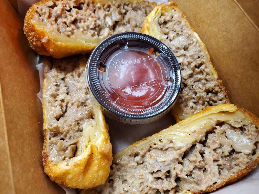 There were a pair of cheesesteak egg rolls, each cut in half so that the meat and cheese were exposed.