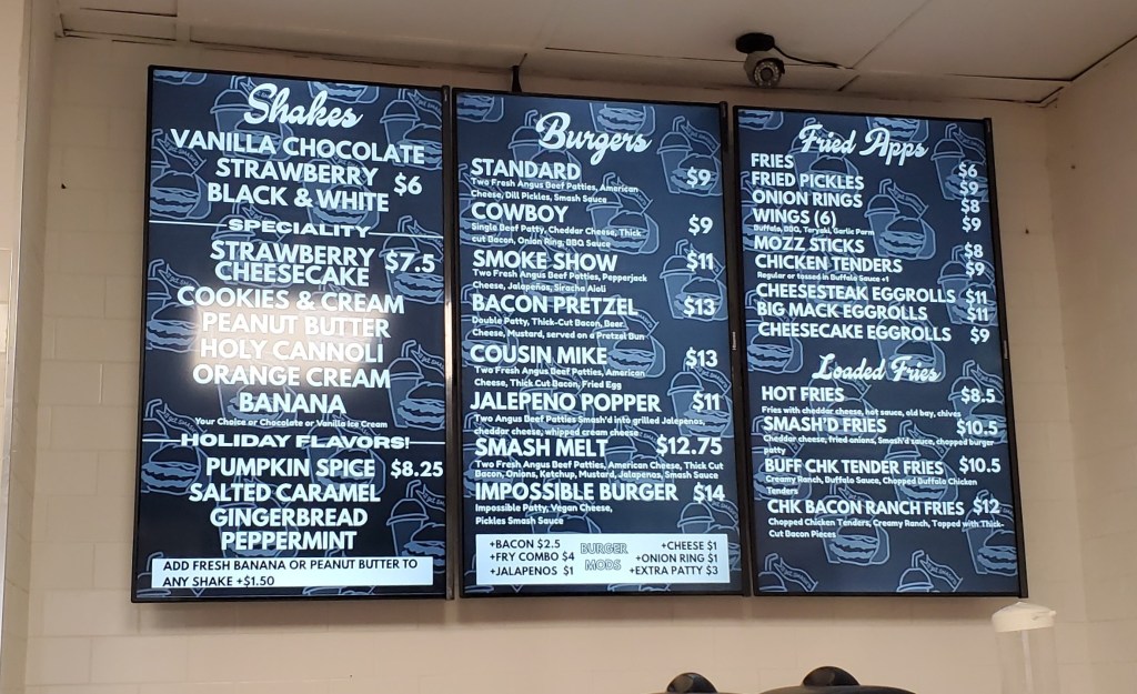 The outside signage at Smash’d promotes them as specializing in burgers and milkshakes. While I normally love shakes, it was too cold that day for me to get one. But in addition to their great looking smashed burgers, the photos of their cheesesteak egg rolls also grabbed my attention, and I requested an order of those with my burger.