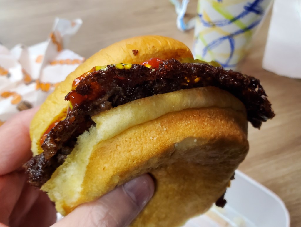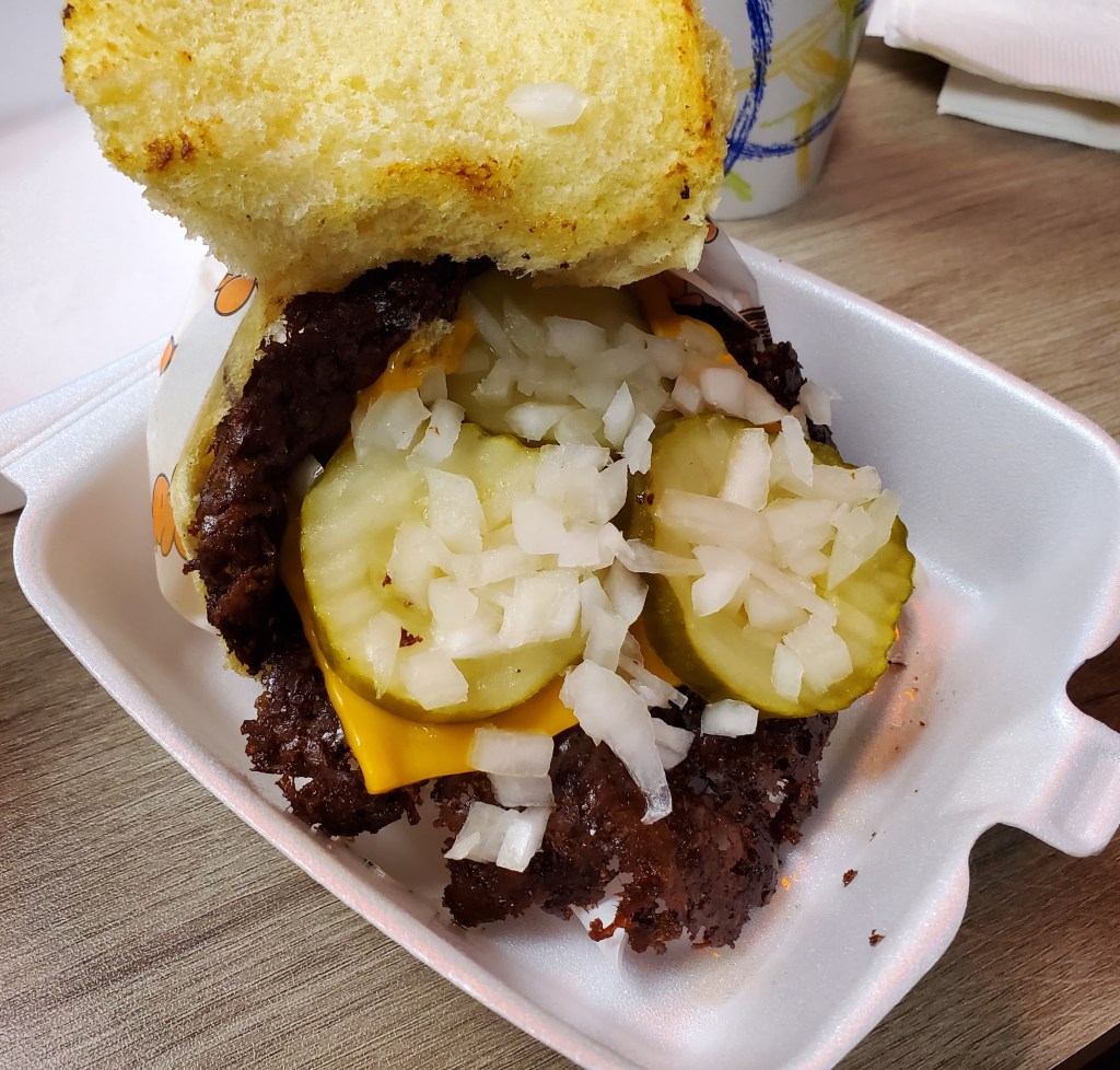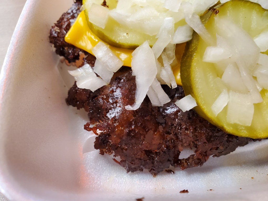 My order was brought out to me after a relatively short wait and I immediately noticed the crusty exterior and nearly paper-thin flappy edges on the hamburger. That’s exactly what the best smashed burgers I’ve had during my travels in the Midwest have looked like.
