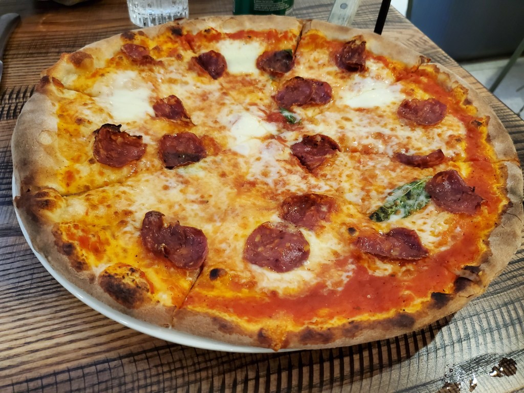 In any event, we ordered three of them – one plain and one each with pepperoni and sausage. The pizzas at Salvy are a smallish 12-inches, so that’s not as much food as you may think it is.